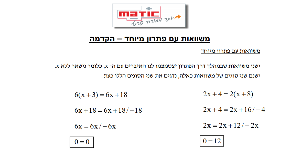 משוואות: 10 דפים בנושאים משוואות עם נעלם אחד, משוואות עם שברים, סוגריים ופתרונות מיוחדים.